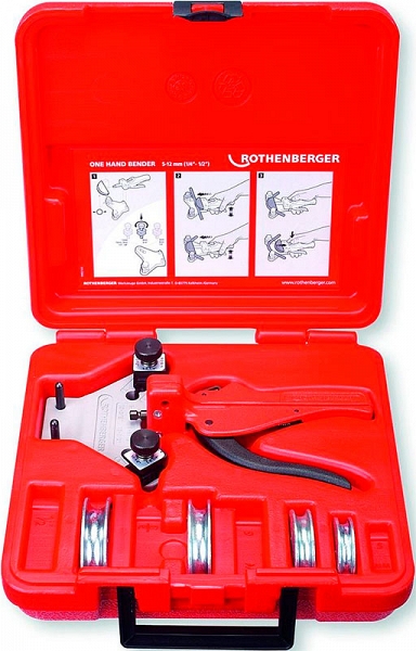 Ручной арбалетный трубогиб Rothenberger Tube Bender Set 6-8-10-12 мм (Ротенбергер Тюб Бендер Сет 6-8-10-12 мм) предназначен для быстрой и точной гибки до 90° мягких медных труб, алюминиевых труб, мягких медных труб в оболочке, мягких тонкостенных стальных труб Ø 6, 8, 10, 12 мм при монтаже систем вентиляции, кондиционирования, водоснабжения, пневматических и гидравлических систем, в автомобилестроении и холодильной технике.
